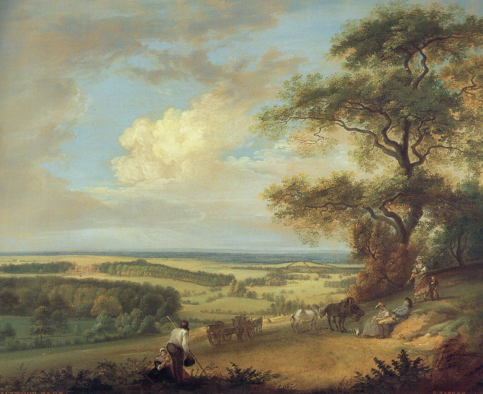 The painting gives remarkably little idea of the best-known feature of Hackwood Park, which is the large classical garden created around the house by the first three Dukes of Bolton. This was laid out on French lines, with a geometric pattern of avenues, canals and basins, as well as classical pavilions designed by James Gibbs. Sandby has taken his view from such a distance that we see nothing from all this but the parterre to the south of the house and the evenly planted row of trees along an avenue leading away to the east. Clearly, it pleased the 5th Duke to regard the setting of his house as rustic rather than formal, and his choice bears witness to a general shift of taste around his time, the beginnings of the “picturesque” movement. in this respect, the work stands in striking contrast to Siberechts’s view of Wollaton Hall (see A Prospect) where the park is marked off from nature rather than integrated. The delight in the rough informality of the country carries over into the comic depiction of the farm workers and horses in the foreground, who are taking their midday rest during the wheat harvesting.” (“This Other Eden”, p. 76)